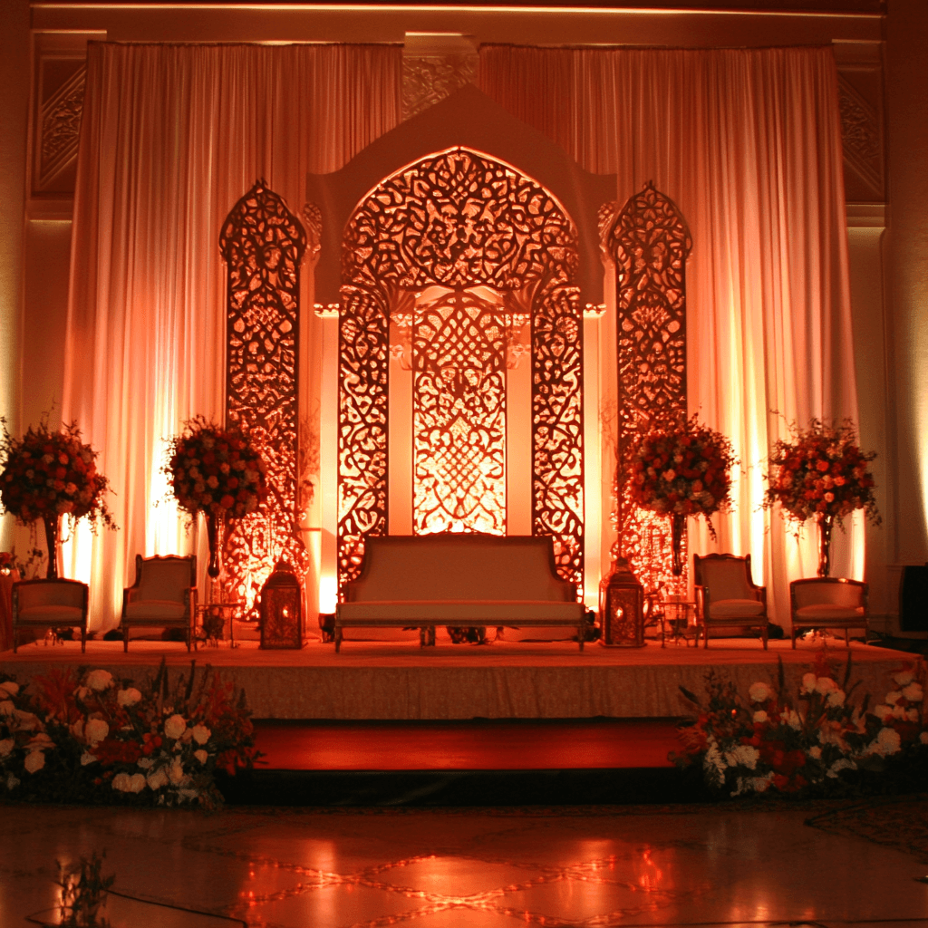 Orientalische Hochzeitsarrangements mit authentischem Flair, Musik und beeindruckender Dekoration.